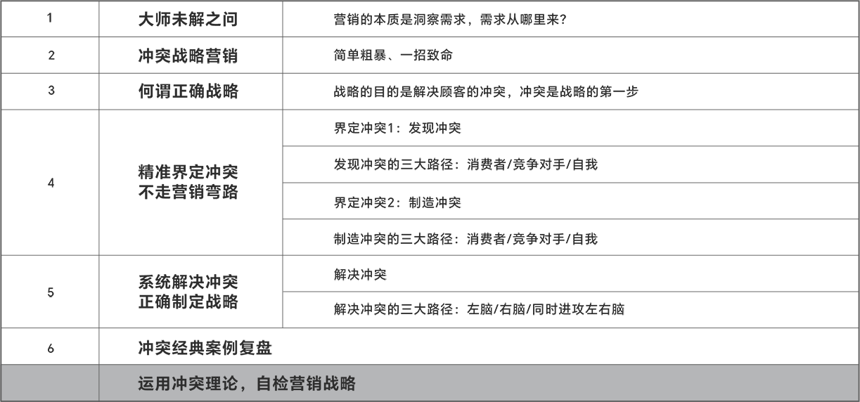 《冲突战略营销第1课》,正确认知营销与战略的底层逻辑;借助真实案例复盘学习冲突理论的战略级思维和实效型方法;以冲突理论,自检自身战略、营销、品牌、产品及广告等关键营销动作是否有效;通过精准界定冲突,不走营销弯路,走向正确战略。